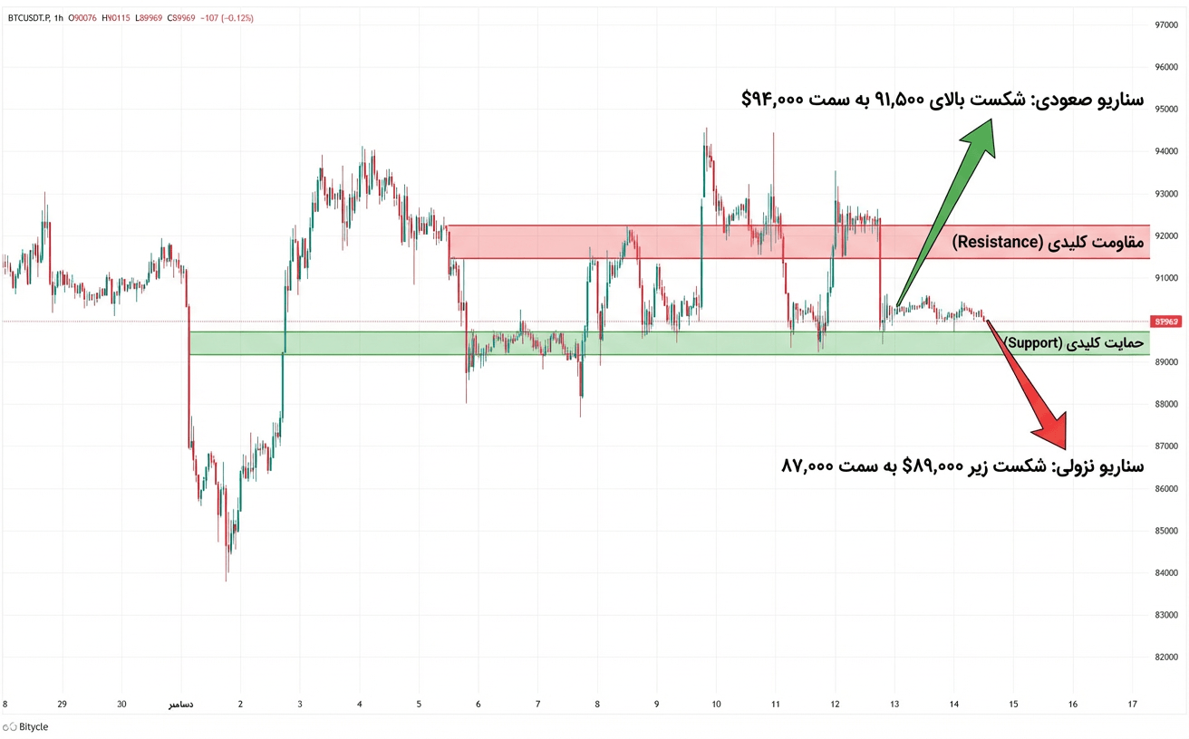 روند فعلی بازار خنثی ارزیابی می‌شود. رویکرد کم‌ریسک، انتظار برای شکست یکی از این دو سطح (عبور از ۹۱,۵۰۰ یا نزول به زیر ۸۹,۰۰۰) جهت تعیین مسیر آتی قیمت می‌باشد.